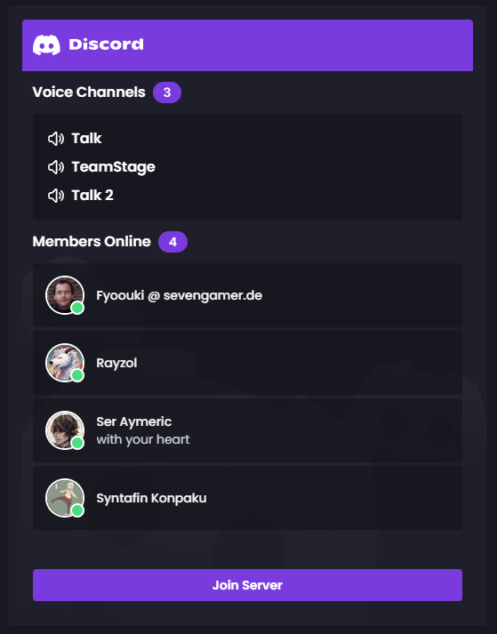 Auf der verlinkten Seite sehe ich nur das gegen die DSGVO verstosende Discord Widget, und das DSGVO konforme Discord Widget von SoftCreatR.